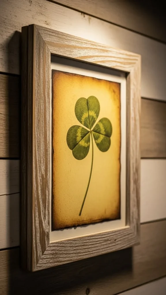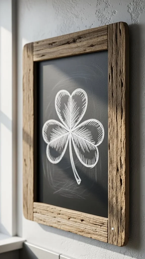 A small chalkboard with a clover sketch fits kitchens and mudrooms. Draw simple outlines. No words required. Use reclaimed wood for the frame. This is easy to update with seasons by changing the drawing. Budget tip: repurpose old frames and paint the glass with chalkboard paint.