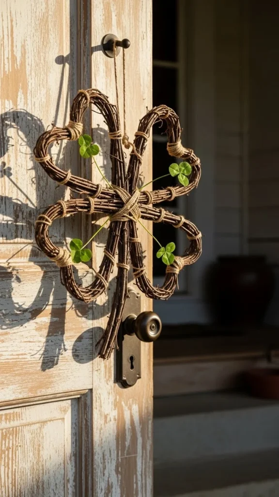 Twig clovers feel organic and simple. Shape twigs into clover forms using floral wire. Hang them on interior doors or cabinets. Let uneven lengths show. This project costs almost nothing and suits rustic homes well.