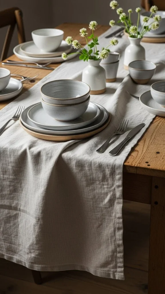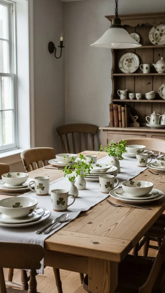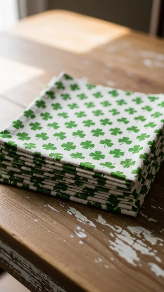 A linen runner printed or stitched with subtle clover shapes adds softness to dining spaces. Natural wrinkles are part of the charm. Choose off-white, oatmeal, or muted sage tones. Skip bold patterns. A simple stitched outline works best. You can sew one using leftover linen fabric and embroidery floss. Even uneven stitches feel right here. For daily use, layer it over bare wood or a cotton tablecloth. It protects surfaces while adding texture. Budget idea: cut a longer linen panel into two runners for smaller tables. If stains happen, don’t stress. Linen looks better with wear. This runner also works on consoles or coffee tables. Fold it lengthwise for narrow surfaces. Add a wooden bowl or small vase on top to ground the look.