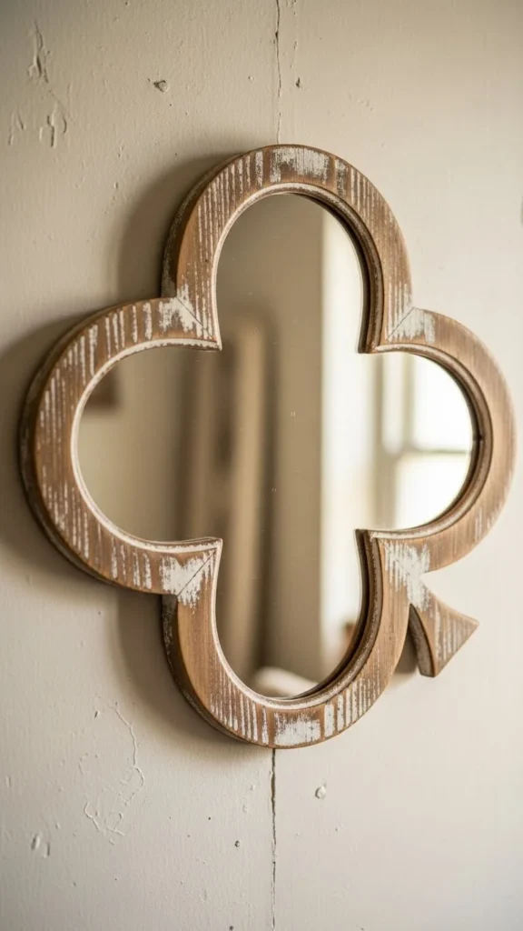 [Image Prompt: Clover-shaped mirror with distressed wood frame on farmhouse wall, soft reflections, DSLR photograph, no text.]