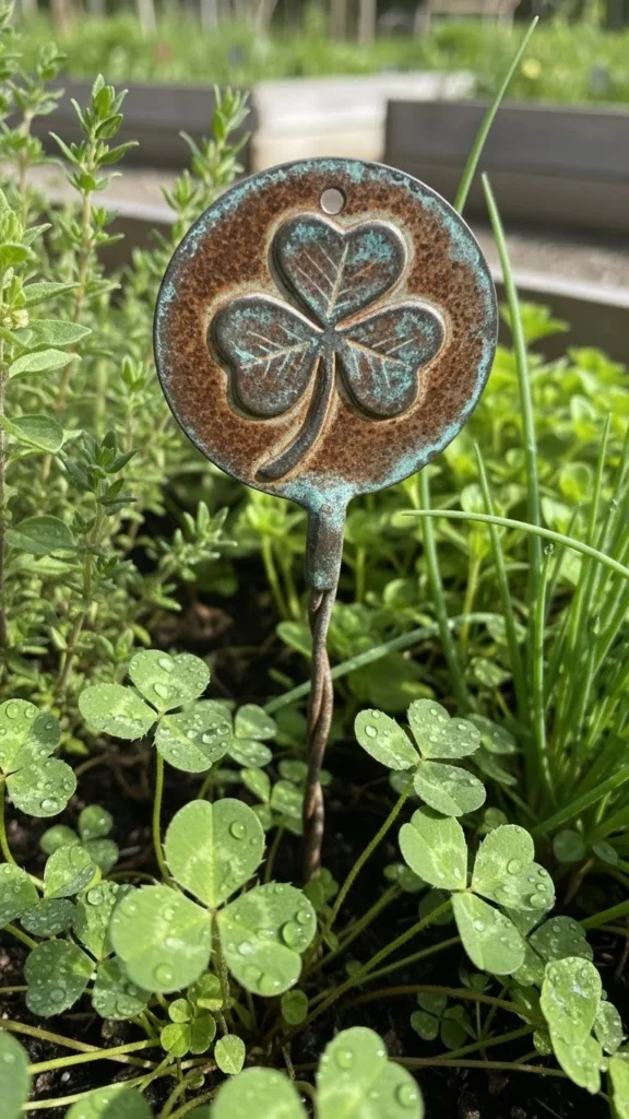 [Image Prompt: Rustic clover plant marker in a farmhouse herb garden, metal tag, natural daylight, DSLR photo, no text.]