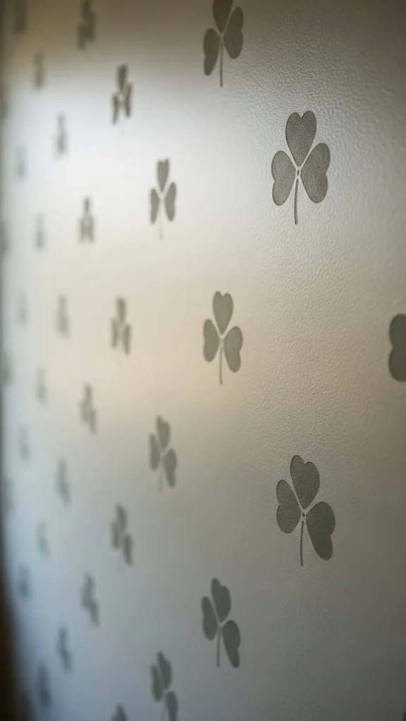 [Image Prompt: Clover wall stencil pattern on a neutral wall, subtle paint tone, farmhouse interior, DSLR photograph, no text.]