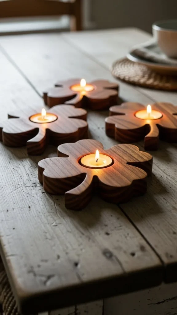 Wooden candle holders carved with clover shapes add warmth. Use tea lights or tapers. Keep finishes raw. Group them in odd numbers. DIY versions can be carved simply without precision.