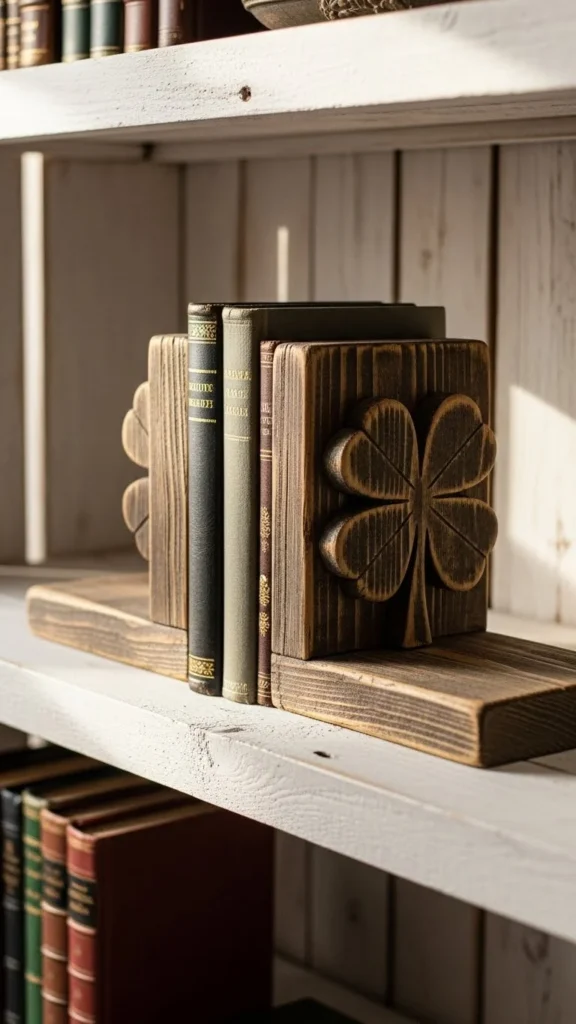 Clover bookends add weight and interest to shelves. Choose wood or stone. Keep designs simple. Budget tip: glue wooden clovers onto basic bookends you already own.