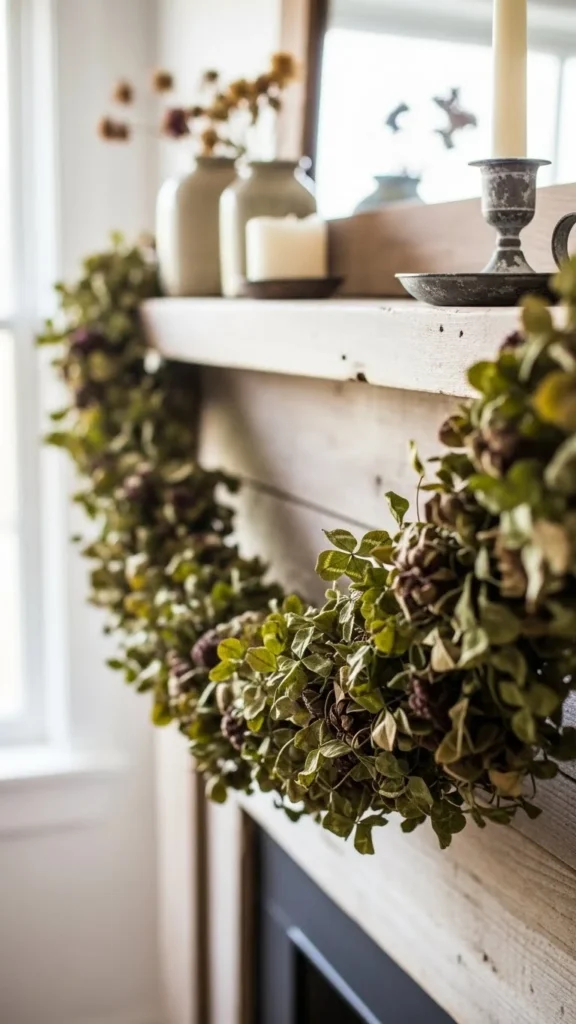 Metal clover wreaths work well indoors or out. Look for thin metal with a dark or rusted patina. Avoid shiny finishes. Hang one on a pantry door, porch wall, or above a fireplace. You can make one using floral wire shaped into clovers and wrapped loosely. Let the joins show. That imperfection adds warmth. Budget-friendly greenery like dried stems or twine bows can be tied on without glue. This makes it easy to adjust through the year. Keep the base neutral so it never feels out of place.