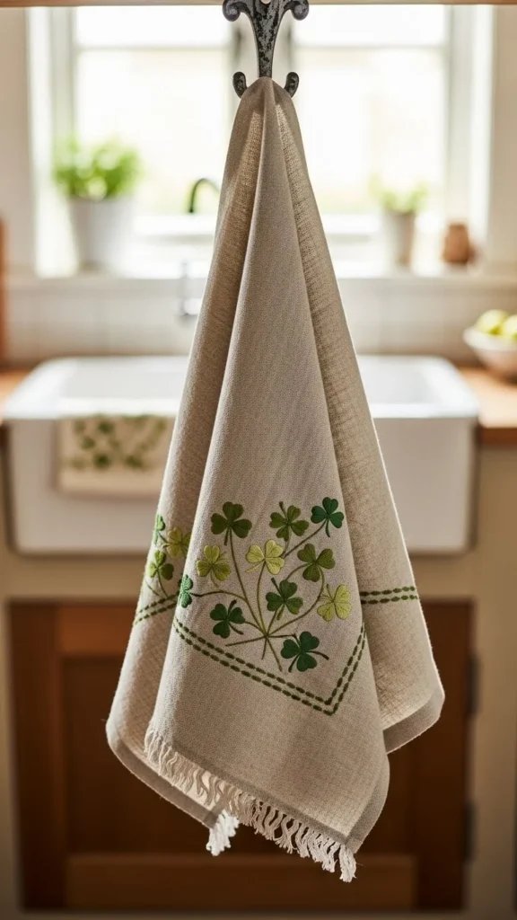 Linen towels with stitched clovers add charm to kitchens. Keep colors neutral. You can stitch simple designs onto plain towels. Rotate them often to keep wear even.