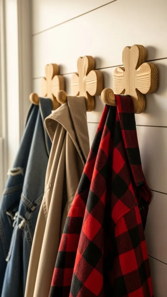 Clover-shaped hooks add function to entryways. Carve them from wood scraps. Mount securely. They hold bags or hats while adding texture.