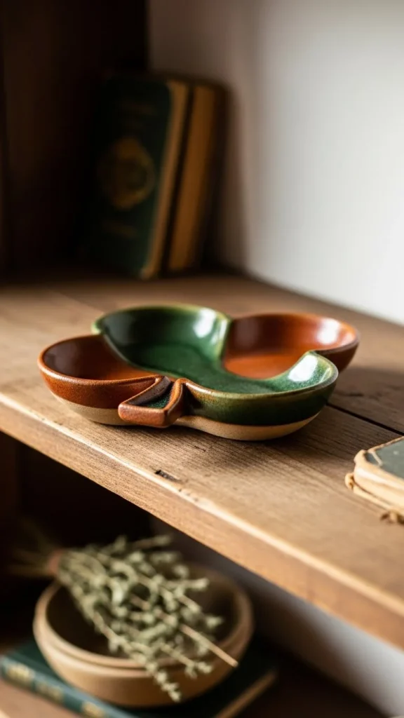 A small ceramic clover dish adds quiet detail to shelves and counters. Look for matte finishes and slightly uneven edges. These feel more natural than glossy pieces. Use the dish for rings, keys, or loose change. In kitchens, it can hold salt or tea bags. If you enjoy pottery, clover shapes are beginner-friendly. Even simple pinch pots can be shaped loosely. Budget tip: check local craft fairs or thrift stores. Handmade ceramics often cost less than big-box decor. Group it with wood and linen so it doesn’t feel alone. One small piece can shift the tone of an entire shelf.