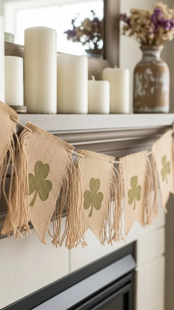 Burlap banners bring texture without weight. Cut clover shapes from burlap scraps and string them on twine. Frayed edges are welcome. Hang the banner loosely across a mantel, headboard, or window frame. Keep spacing uneven for a relaxed feel. This is an easy weekend project. Burlap coffee sacks are often free at local cafes. Wash and dry them first to soften the fabric. Store the banner rolled, not folded, to avoid creases.
