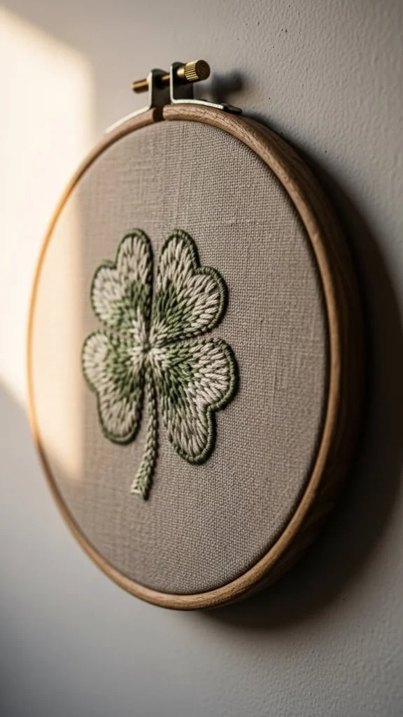 Embroidery hoops add softness to walls. Stitch a simple clover outline onto linen or cotton fabric. No complex patterns needed. Imperfect stitches add charm. Hang one or group three in varying sizes. This works well in bedrooms or hallways. Budget tip: reuse old hoops and fabric scraps. Neutral thread keeps the design calm and flexible.