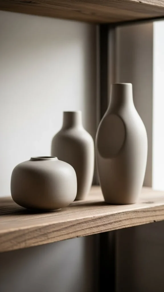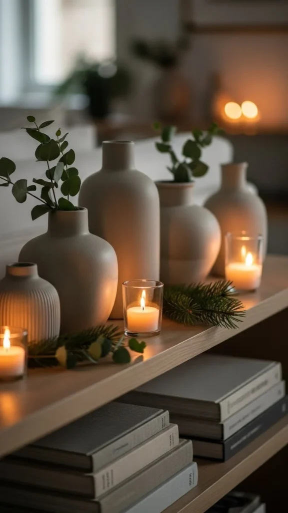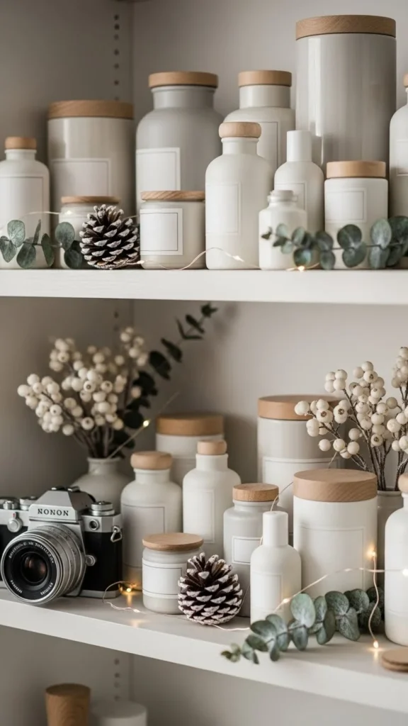 Neutral ceramic vases bring subtle warmth to winter shelves. Choose cream, gray, or soft beige. Group three in varying heights for a simple visual rhythm. Budget tip: thrift stores often have inexpensive mismatched vases. Add a single branch, dried flowers, or cotton stems for seasonal flair. Leave breathing space around the vases. This setup works on open shelves in living rooms, kitchens, or bedrooms. Rotate stems weekly for a fresh, effortless winter look.