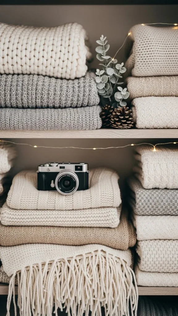 Small folded throws add softness and color. Use light neutral shades for consistency. Fold neatly and place on the edge of a shelf or basket. Avoid bulky throws that dominate. Rotate colors seasonally. Throws bring texture and comfort to shelves, creating a cozy winter aesthetic.
