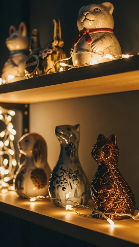A few ceramic or neutral-toned figurines add personality. Choose simple shapes or abstract designs. Avoid cluttering with too many pieces. Pair with plants or books to create layered looks. Budget-friendly: thrift stores or DIY clay pieces work. Stick to one color family. Even a single statement piece can anchor a shelf design.