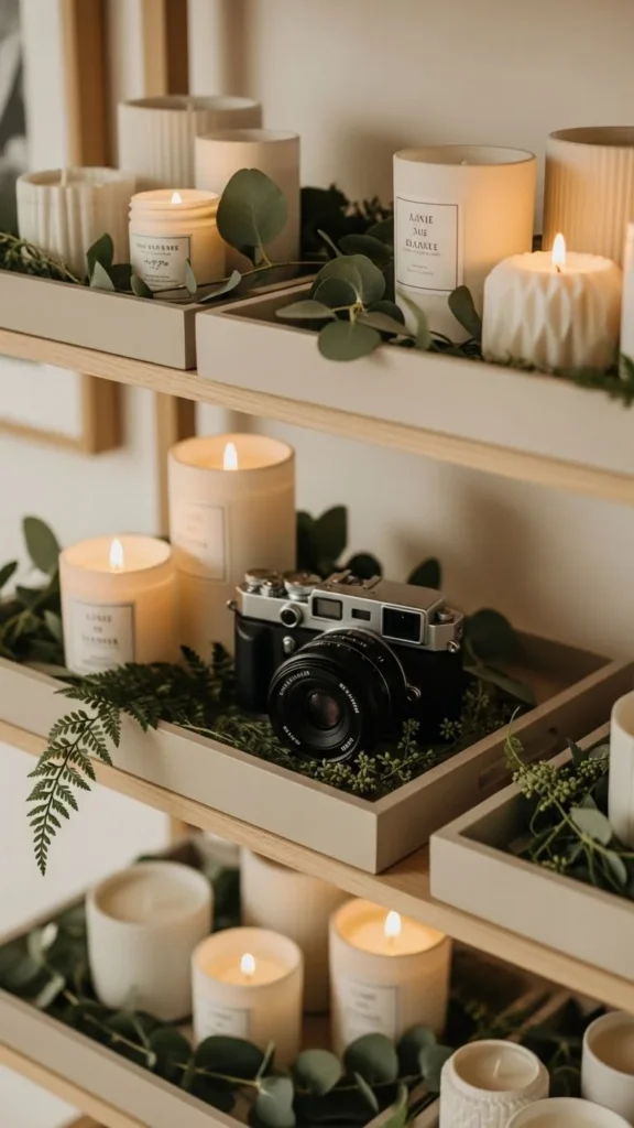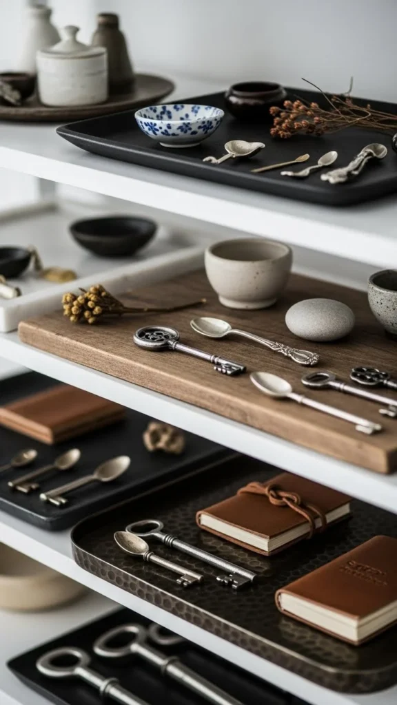 Combine trays with candles and greenery. Stack a small tray, then add two or three objects. Vary heights and textures. Keep colors neutral. Budget-friendly: repurpose old trays. Layering creates interest without cluttering the shelf.