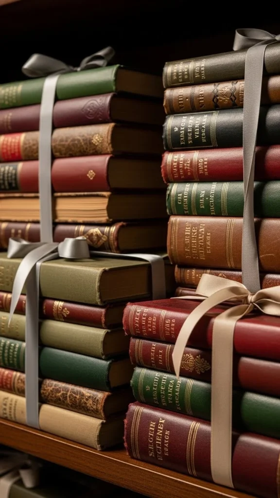 Tie old books with ribbon for decorative charm. Stick to neutral tones or winter colors. Vary stack heights for visual interest. Budget-friendly: thrift or library sales provide inexpensive options. Avoid overstuffing—two or three stacks per shelf are sufficient. Adds character and seasonal charm.