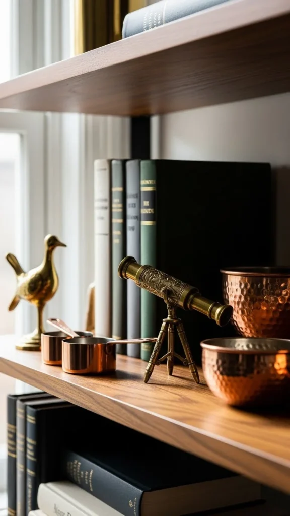 Add subtle shine with small metallic objects. Use brass, copper, or matte gold for warmth. Avoid large shiny pieces that dominate. Combine with natural textures like wood or ceramics. Budget-friendly: small decorative objects or thrifted pieces work well. One metallic item can enhance a shelf’s winter aesthetic.