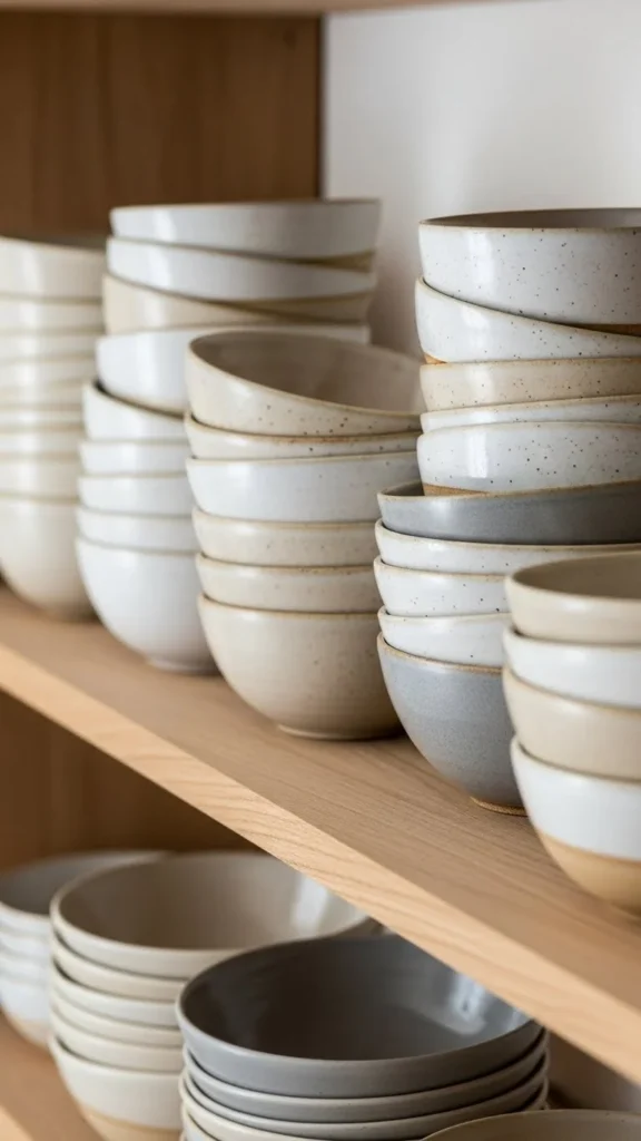 Stack neutral bowls to add height and interest. Use plain or lightly textured ceramics. Avoid bright colors. Mix sizes for dimension. Place near a plant or candle cluster. Perfect for kitchen shelves or living room displays. Budget-friendly: thrift stores often have inexpensive options.