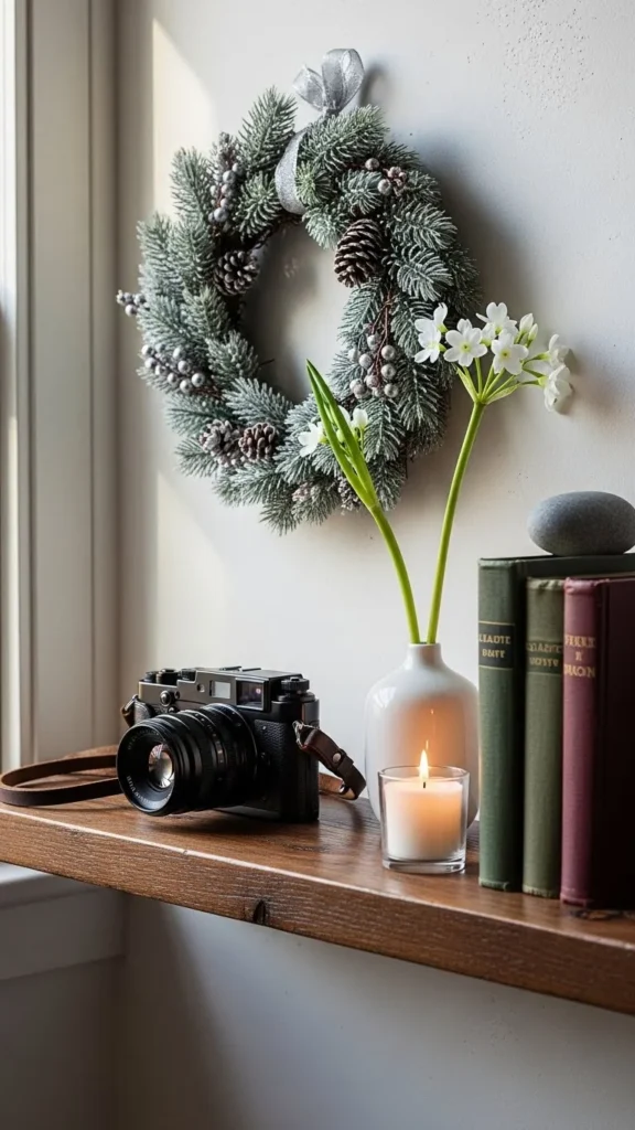 A small winter wreath adds subtle seasonal charm. Place on a shelf or lean against the wall. Stick to neutral or muted greens. Avoid oversized wreaths that overpower other objects. Swap wreaths for different seasons without nails. Adds texture and seasonal appeal effortlessly.