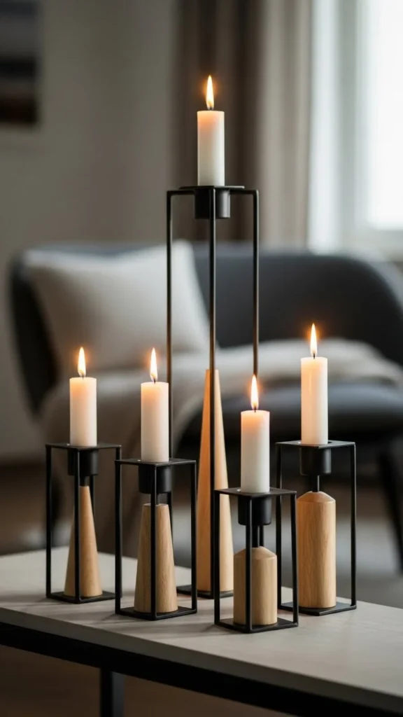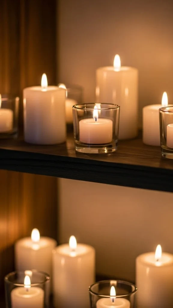 Height variation creates interest on a shelf. Use holders of metal, ceramic, or glass. Stick to two or three colors or materials for cohesion. Place taller pieces at the back, shorter in front. Odd numbers work best. Budget tip: mix inexpensive holders with one statement piece. Candles reflect soft light, enhancing winter warmth.