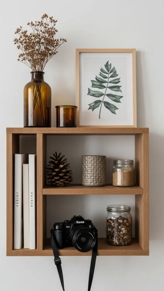 Leave breathing room between objects. Overcrowding reduces a curated feel. Focus on balance and proportion. Move objects slightly apart. Open space emphasizes each piece. Minimal adjustments create maximum impact. This simple step often changes the shelf’s overall look.