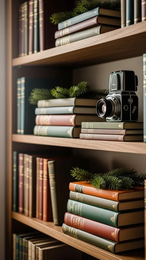 Combine stacked books with small greenery sprigs for a layered winter look. Place taller sprigs at the back, shorter in front. Stick to one color palette. This adds seasonal texture without clutter. Budget-friendly: clip greenery from outdoors or use faux branches. Works well across living room or kitchen shelves.