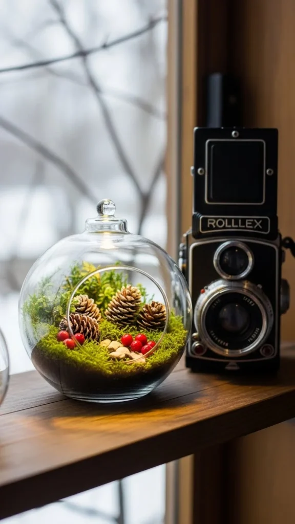 Glass terrariums add winter interest and depth. Fill with moss, pinecones, or miniature branches. Use one or two per shelf to avoid overcrowding. Neutral or clear glass maintains a curated feel. Budget tip: repurpose jars or small glass containers. Terrariums provide visual texture and a subtle winter touch.