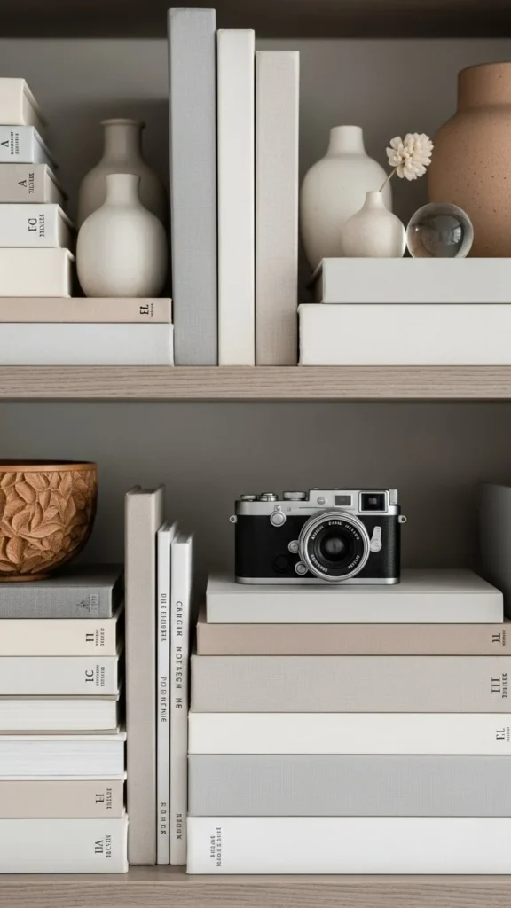 Stack books horizontally to create height and add small decorative objects on top. Keep colors consistent: neutral or muted tones work best. Avoid overloading each stack. Use odd numbers for objects—three often feels balanced. Swap objects seasonally for subtle winter updates. Vertical books beside stacks create visual balance. This method adds texture and interest without extra spending.