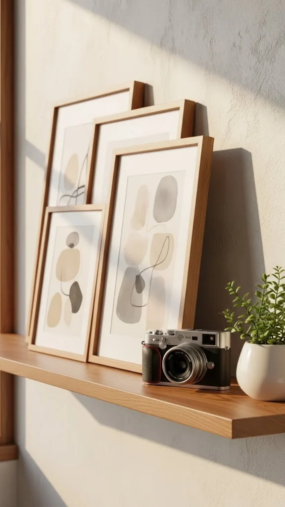 Lean small framed art against the wall instead of hanging it. Neutral abstract pieces work best in winter. Layer in front of other objects like vases or books. Avoid overcrowding frames—let each breathe. Budget tip: print art from online sources and frame inexpensively. Leaning frames create an effortless, gallery-like feel.