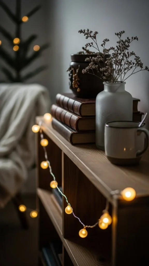 Subtle lighting softens the shelf’s appearance. Drape a string of warm LED fairy lights across the back or edges. Battery-powered options prevent cord clutter. Pair with neutral decor for a gentle glow. Keep lights tucked behind objects to avoid tangling. Adds cozy winter charm without dominating the shelf.
