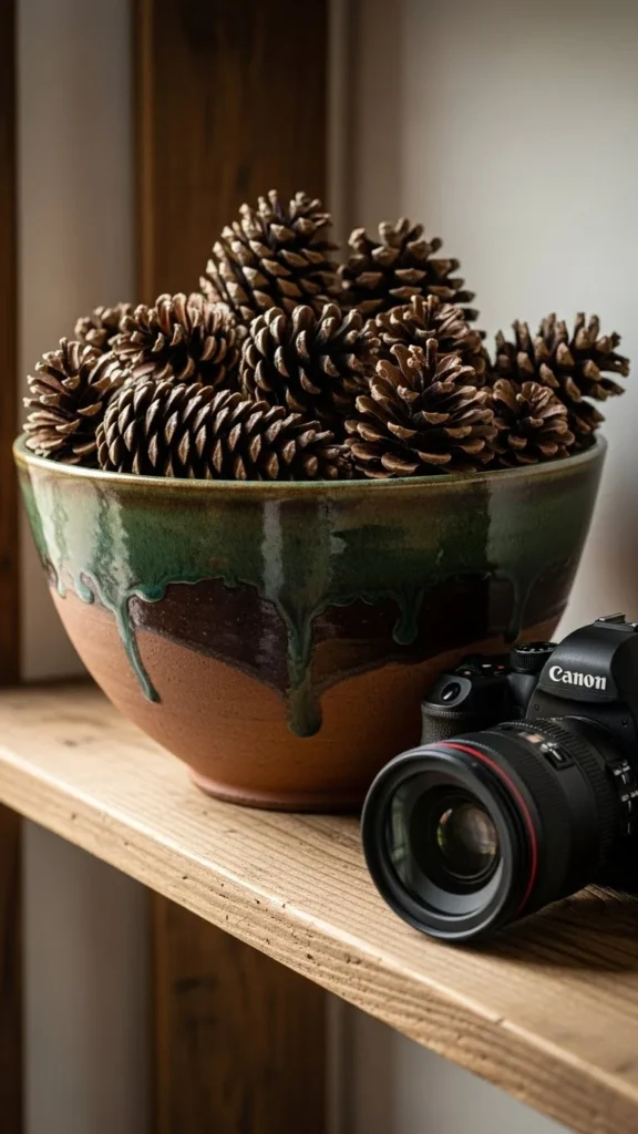 Fill a simple bowl with pinecones for natural winter texture. Use neutral ceramic or wooden bowls. Add small sprigs of greenery inside for variety. Collect pinecones outdoors to save money. Place at the center or one end of the shelf for visual balance. Combine with candles or small vases for layering.