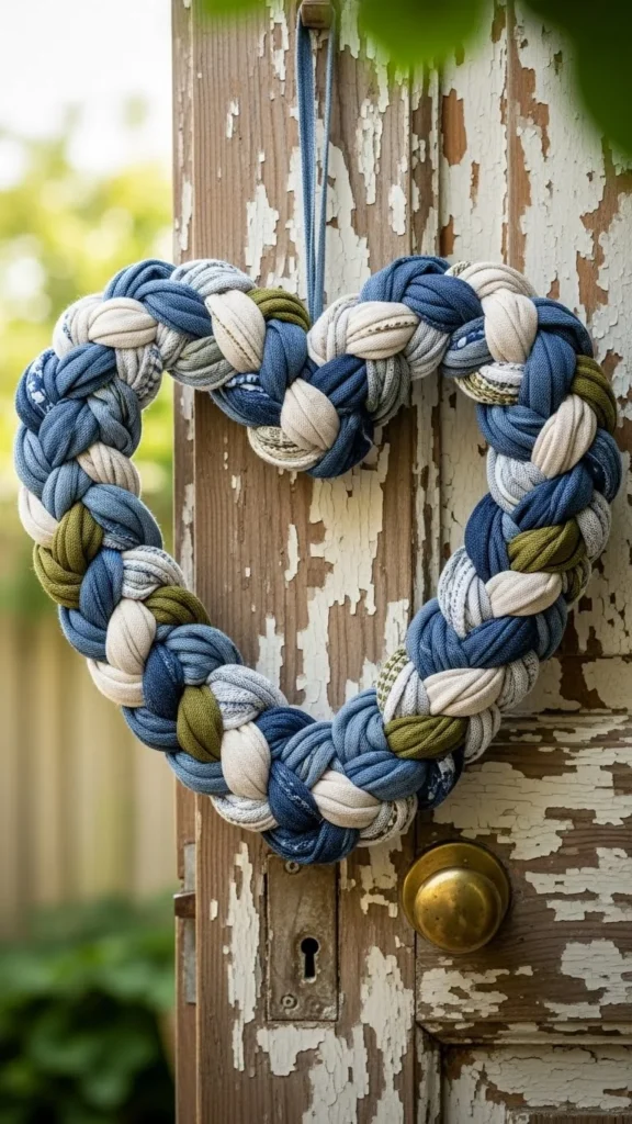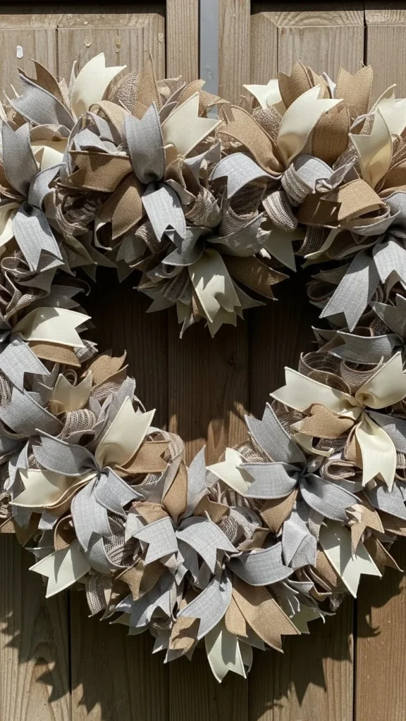 Use neutral tones so it blends with other decor. This wreath fits well in entryways. For a cheaper option, use fabric scraps from old curtains.
