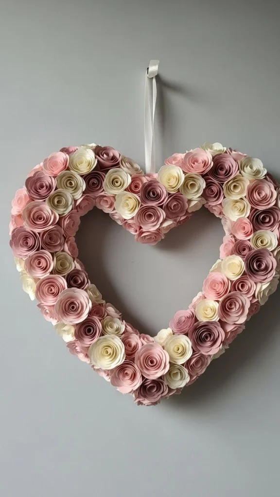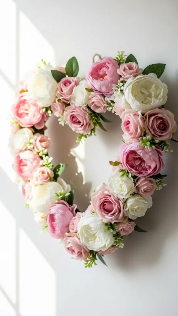 A pink floral heart wreath feels classic and gentle. Faux flowers are budget-friendly and reusable. Choose two flower types to keep costs low. Mix pink with cream for balance. Glue flowers closely to hide the base.