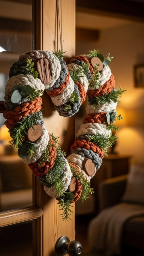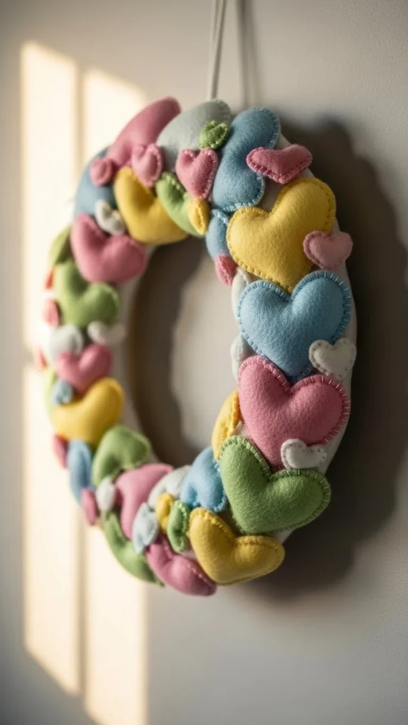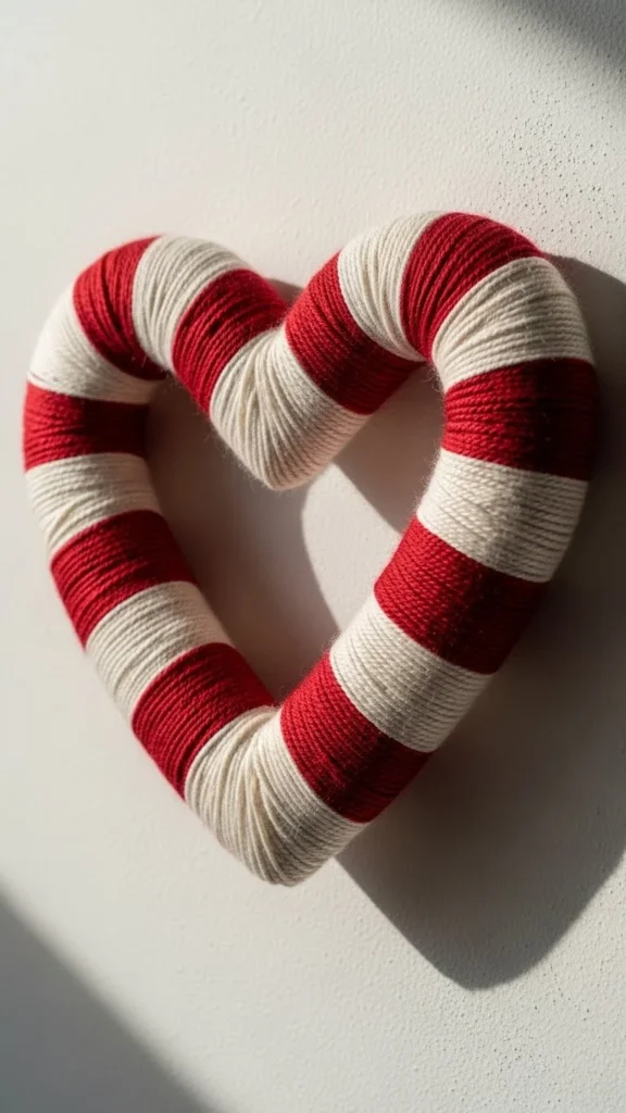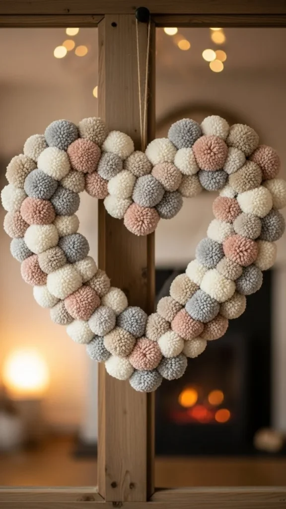 Yarn wreaths feel warm and handmade. Choose one main color and one accent. Wrap yarn tightly around a foam or wire heart.