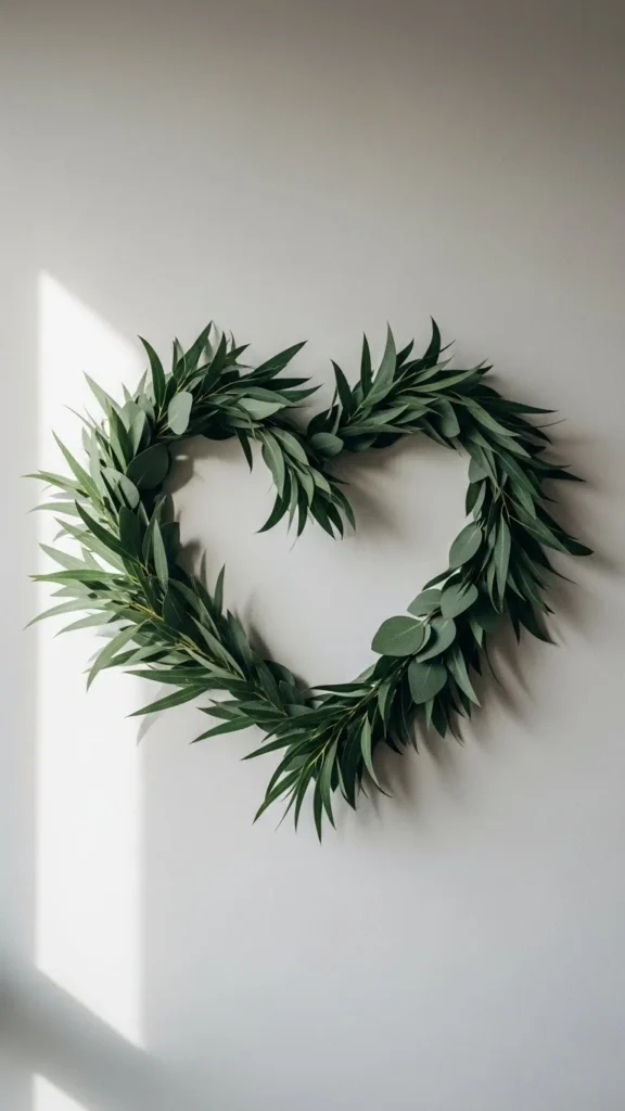 Greenery wreaths suit modern homes. Faux eucalyptus is affordable and easy to shape. Bend stems around a wire heart frame. Secure with floral tape.